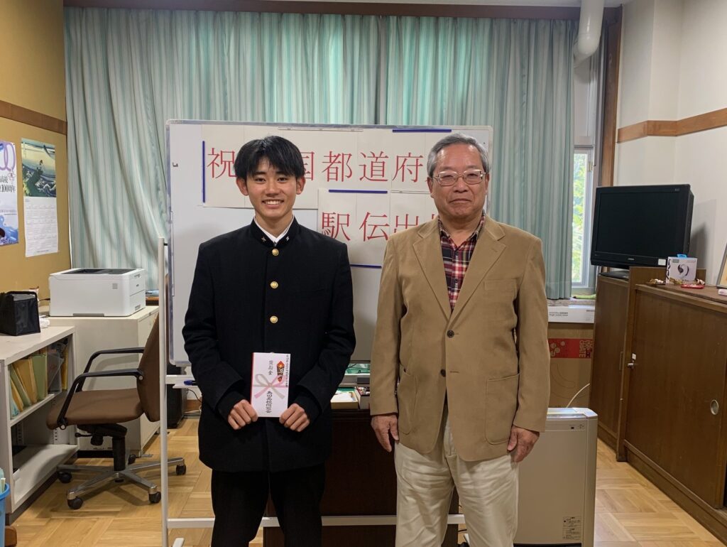 鶴木同窓会長から、2年陸上部の内海くんへ、1月18日に行われた第31回全国都道府県対抗男子駅伝に選手として出場したことを祝い、今後の練習への激励品が贈られました。
